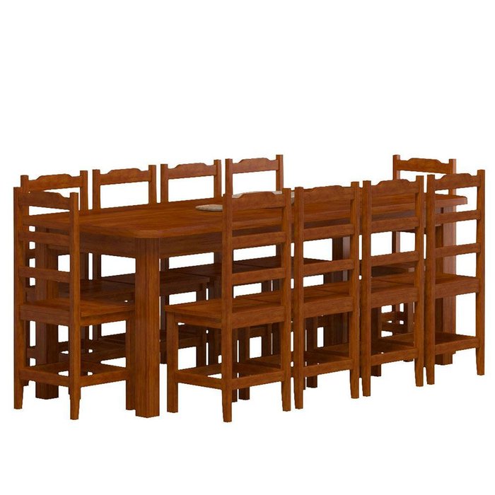 Dimensões da Mesa: Largura 88cm; Profundidade 220cm; Altura 81cm.Dimensões da Cadeira: Largura 39,6cm; Profundidade 38,5cm; Altura 100cm.Altura do Assento Até o Chão: 46cm.Itens Inclusos: 1 mesa com 10 cadeiras.Especificações da Mesa- Estrutura e pés em madeira maciça de Pinus (madeira reflorestada)- 4 pés resistentes- Design robusto e clássico- Tampo em MDPEspecificações da Cadeira- 100% madeira maciça de Pinus (madeira reflorestada)- Cadeiras são entregues montadas para maior comodidade- Suporta até 150kgComplexidade da montagem: Média, pode ser montado por apenas uma pessoa e/ou necessite de maior conhecimento para montagemRecomendações de uso, manutenção e limpeza: Limpar com flanela ou pano macio seco, não utilizar produtos abrasivos, desengordurantes, álcool ou solvente. Não expor o produto diretamente à luz solar e à umidadeGarantia: 3 mesesOBS: O produto chegará desmontado novo na caixa, não realizamos o serviço de montagem. Orientamos que ao receber o produto, contrate um profissional de montagem para que seja efetuado a montagem do produto.Tonalidade das cores poderão sofrer alterações conforme a configuração de cada monitor ou tela do smartphone.