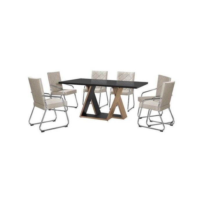 Mesa de Jantar Etna com Vidro Canelato com Preto com 6 Cadeiras Ibizza Bege Cromada - Aço Nobre