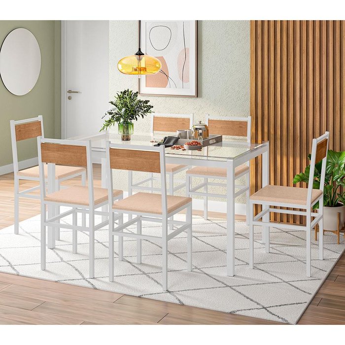Mesa de Jantar Fabone Alexa com 6 Cadeiras Conceito Branco, Natura e Bege