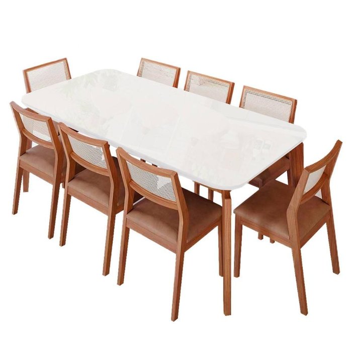 Conjunto Mesa de Jantar Ficus 2,10m com 8 Cadeiras Bella – Madeira/Off White/Kaki – CimolO Conjunto Ficus com 8 Cadeiras Bella é a escolha perfeita para quem busca elegância, amplitude e sofisticação na sala de jantar. A mesa conta com estrutura em madeira Tauari e acabamento em verniz natural, garantindo resistência e beleza. Seu tampo em MDF/Vidro temperado proporciona um visual refinado e durável.As Cadeiras Bella combinam charme e conforto, com assento estofado em espuma D-20 revestida em courino, além de encosto em tela sextavada sintética, que traz leveza e um toque moderno ao ambiente. Ideal para recepções, jantares e momentos especiais com a família.Especificações da Mesa:Modelo: FicusMedidas: Largura 210 cm x Profundidade 100 cm x Altura 77 cmMedida do tampo: 100 cm x 210 cm x 2,9 cmEstrutura: Madeira TauariTampo: MDF laminado com vidro temperadoEspessura do tampo: 25 mmAcabamento: Verniz naturalSuporta até 40 kgNão extensívelEspecificações das Cadeiras:Modelo: BellaQuantidade: 8 unidadesMedidas: Altura 86 cm x Largura 47 cm x Profundidade 52,5 cmEstrutura: MadeiraAcabamento: Verniz naturalAssento: Espuma D-20 revestida em courino (almofada fixa)Encosto: Tela sextavada sintéticaSuporta até 120 kg cadaInformações Gerais:Material: MDF/Vidro, madeira Tauari, espuma e courinoCor: Madeira/Off White/KakiPeso total: 108,18 kgGarantia: 90 dias contra defeito de fabricaçãoProduto precisa de montagem (complexidade média)Instruções de limpeza: pano seco ou levemente umedecido, sem produtos abrasivosAtenção antes da compra:Confira as dimensões do produto e certifique-se de que passam por portas, corredores e elevadores.Prédios: não realizamos montagem/desmontagem, transporte por escadas ou içamento.Condomínios: entrega no térreo, transporte interno é responsabilidade do cliente.Transportadora não realiza: entrada no domicílio, içamento, montagem, coleta de devolução, entrega em endereço diferente do DANFE ou a menores de idade/sem documento.Observações:Fotos meramente ilustrativas.Objetos de decoração não acompanham o produto.Pode haver variação de tonalidade conforme o lote.Conferir o produto no ato da entrega junto ao entregador.