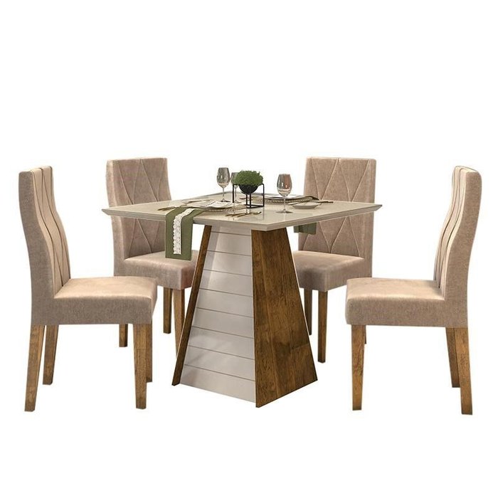 A Mesa Gris é o que você precisa para decorar a sua sala de jantar, o design moderno da base em formato trapézio aliado ao tampo chanfrado com vidro, vão deixar seu ambiente mais sofisticado. Ela é ideal para espaços compactos e acomoda 4 pessoas confortavelmente. Os frisos decorativos no centro da base, dão um charme especial ao produto, um diferencial único e moderno. Já a Cadeira Manuela Possui um design moderno e sofisticado, o grande diferencial para esta cadeira são suas curvas ergonômicas que proporcionarão um conforto incomparável. O assento e o encosto são estofados com um agradável tecido de cores atuais e de fácil combinação. Destaque para o bordado no encosto que dá um charme especial ao produto. Complemente sua sala de jantar com bom gosto e sofisticação.
