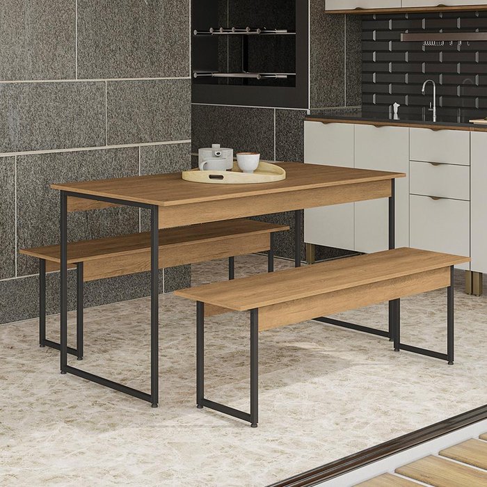 Mesa de Jantar Industrial com 2 Bancos Freijó 1,36m Freijó/Preto fosco