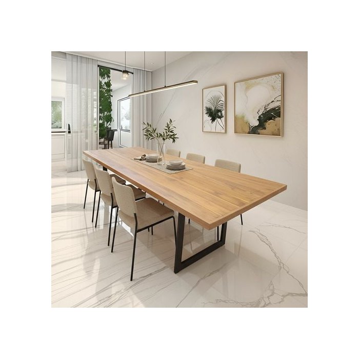 A Mesa de Jantar Estilo Industrial Madeira Maciça Teca com Pé Metal Preto é a escolha perfeita para quem busca um móvel robusto e cheio de estilo para a sala de jantar ou cozinha. Com capacidade para até 8 pessoas, é ideal para receber amigos e familiares em ocasiões especiais. Design Impecável, uma fusão perfeita de estilo clássico e contemporâneo, tornando-a uma peça que se destaca em qualquer ambiente. Feita para resistir ao teste do tempo, esta mesa é um investimento duradouro que mantém sua beleza e integridade ao longo dos anos. Além disso, seu comprimento de 220 cm proporciona espaço de sobra para refeições confortáveis e agradáveis. A montagem é simples e rápida, permitindo que você desfrute de sua nova mesa em pouco tempo. Adquira já a Mesa de Jantar Industrial Madeira com Pé Metal Preto e transforme sua casa em um ambiente acolhedor e cheio de personalidade. Uma das características mais notáveis da madeira teca é a sua resistência natural a insetos, fungos e condições adversas, como umidade e intempéries. Esta resistência é atribuída ao alto teor de óleos naturais e sílica presentes na madeira, que atuam como uma barreira protetora contra pragas e deterioração. Isso faz com que a teca seja amplamente utilizada em ambientes externos, como em decks, móveis de jardim e em aplicações náuticas, onde outras madeiras poderiam falhar rapidamente. O acabamento em fundo seladora e cera carnaúba garante um toque de sofisticação, enquanto o estilo industrial adiciona um ar moderno ao espaço. Com medidas de 220x100x78cm, esta mesa retangular é perfeita para ambientes internos e externos (cobertos), como área gourmet, churrasco, jardim e varanda. Requer montagem, mas o resultado final certamente valerá a pena. Seja para refeições do dia a dia ou para eventos especiais, a Mesa de Jantar Industrial Tampo Madeira Maciça da MADEIRA DECOR SHOP é a escolha certa para quem busca qualidade, resistência e design único. Adquira já a sua e transforme seu espaço em um ambiente acolhedor e cheio de personalidade.