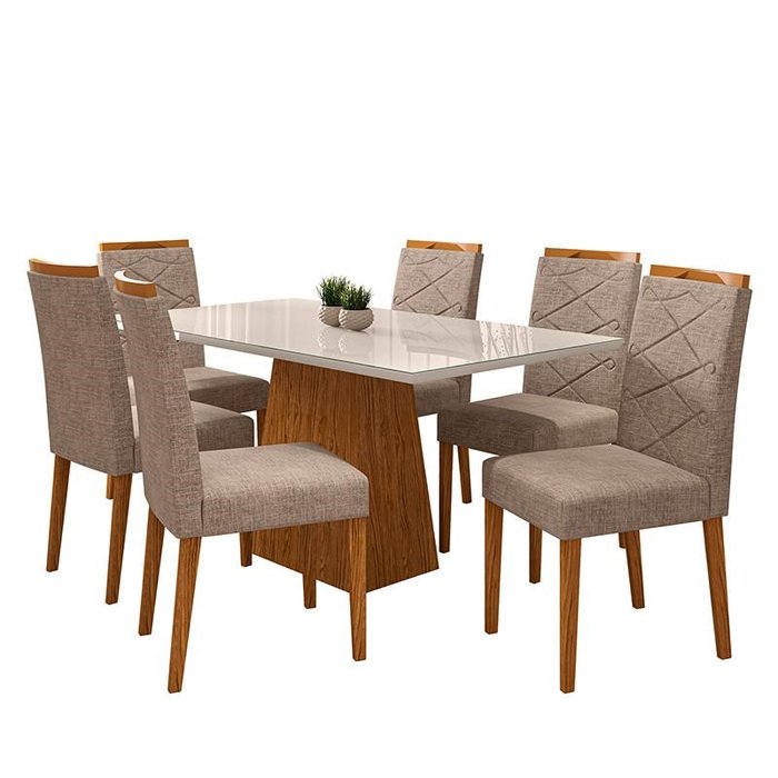 Mesa de Jantar Jasmin 160x90 com 6 Cadeiras Caroline Ipê/Off White/Linho Marrom Claro - PR Móveis