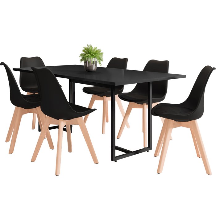 Mesa de Jantar Maldiva Industrial F01 com 6 Cadeiras Ayla Preto Base de Madeira Preto fosco