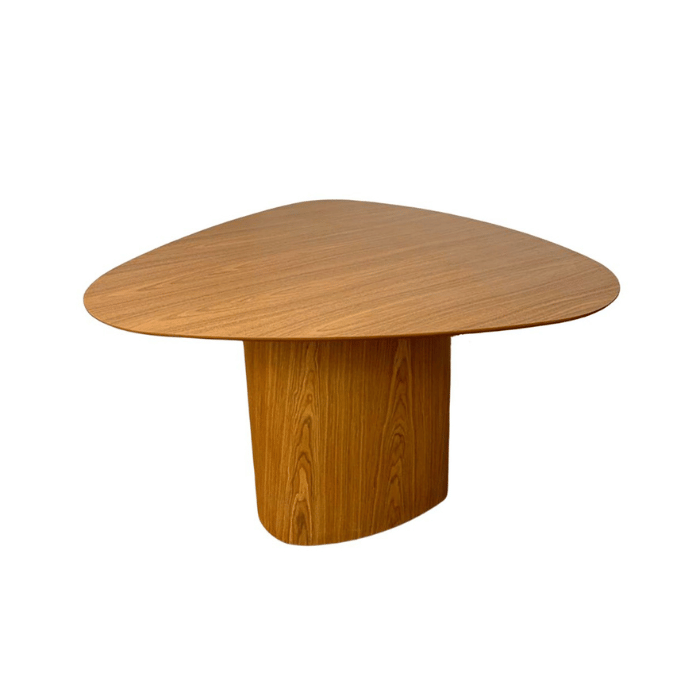 Tampo em MDF melamina Freijó 180x160 cm, com contra tampo em MDF melamina Freijó, base orgânica triangular estrutura em madeira e MDF laminado em madeira Freijó