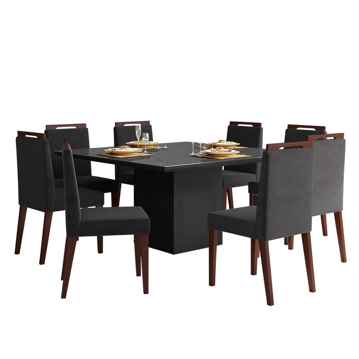 Mesa de Jantar Preto 150x150 cm com 08 Cadeiras Denise Castanho/Veludo Preto - D'Rossi