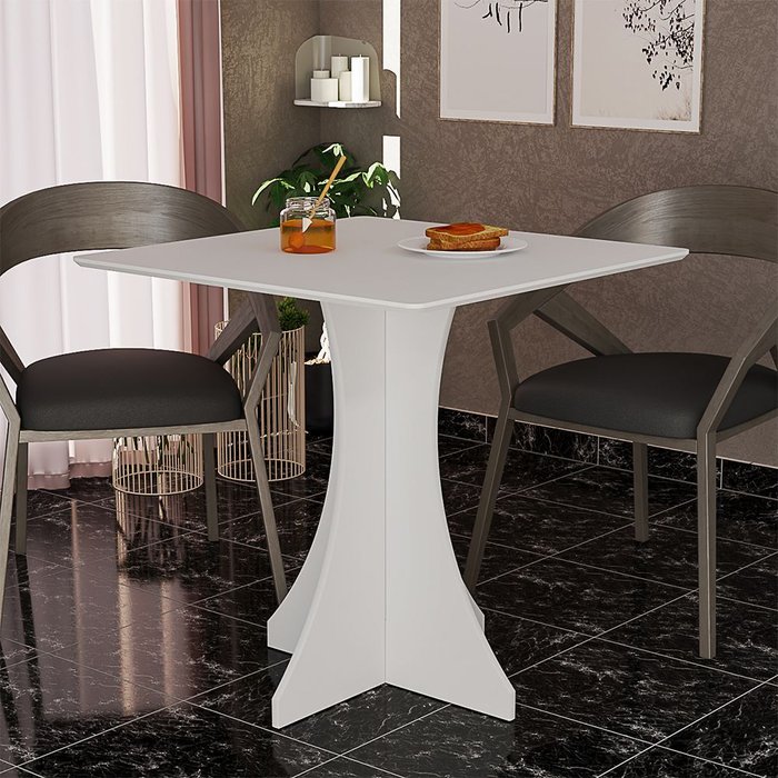 Com tampo quadrado e cantos levemente arredondados, é ideal para ambientes menores, proporcionando conforto e praticidade no dia a dia. Produzida em MDF, oferece resistência e acabamento de qualidade. Sua base central em formato ?X? com recortes curvos garante estabilidade e um visual contemporâneo que se adapta facilmente a diversos estilos de decoração. Uma escolha inteligente para varandas, cozinhas ou salas de jantar modernas.