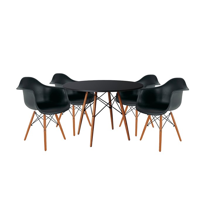 Mesa de Jantar Redonda Eiffel Eames em Madeira 110cm Preta com 4 Poltronas Pretas