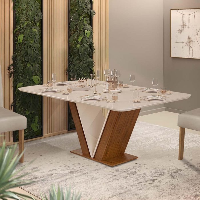 A Mesa Rute possui um design moderno em formato de trapézio inclinado, com peças formando um "V" vazado, o que a torna elegante e leve. O tampo parece flutuar sobre essas peças, adicionando um toque de modernidade. Detalhes charmosos incluem uma linha de sombra entre o "V" interno e externo, proporcionando profundidade ao design. O tampo é revestido com vidro pintado para durabilidade e facilitar a limpeza, enquanto os cantos arredondados garantem segurança. Produzida em MDF e MDP provenientes de reflorestamento, essa mesa combina sofisticação com sustentabilidade e acomoda até 6 pessoas, tornando o espaço aconchegante e contemporâneo.- MDP e MDF utilizados para resistência, acabamento refinado e sustentabilidade- Impressão U.V. texturizada fosca e alto brilho para definição e durabilidade- Apoio inferior de 25mm e base reforçada de MDP 15mm para robustez- Sapatas deslizadoras para facilidade de manuseio e limpeza- Tampo de MDF 25mm com revestimento UV, cantos arredondados e borda com pintura PU- Vidro pintado de 4mm de espessura com cantos arredondados de raio 100mm colado no tampoDimensões do Produto: Largura 160 cm; Profundidade 90 cm; Altura 80 cm.Itens inclusos: 1 Mesa de JantarComplexidade da montagem: Média, pode ser montado por apenas uma pessoa e/ou necessite de maior conhecimento para montagem.Recomendações de uso, manutenção e limpeza: Limpar com flanela ou pano macio seco, não utilizar produtos abrasivos, desengordurantes, álcool ou solvente. Não expor o produto diretamente a luz solar e à umidade.Garantia: 3 meses.OBS: Foto meramente ilustrativa, decoração não faz parte do produto.Manual de Montagem e Instalação