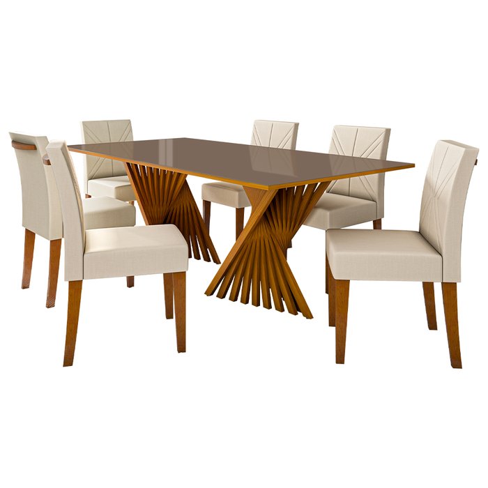 Mesa de Jantar Retangular e Vidro Cappucino Karen com 6 Cadeiras Betânia Bege 180x100 Fabrispuma Cappuccino