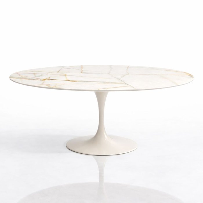 Mesa de Jantar Saarinen Oval, Tampo em Mdf Calacata, com contra tampo em MDF, Base em alumínio fundido com pintura automotiva PU.