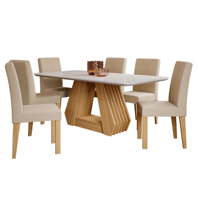 Mesa de Jantar Tampo de Vidro Off White Agata 1,80 e 6 Cadeiras Maia Nature/GengibreQue tal reunir a sua família para um jantar? Nesse momento a Cimol vai está presente, proporcionando situações agradáveis e descontraídas! A mesa Agata possui uma base em formato triangular, seu tampo é em mdf/vidro com bordas chanfradas e acabamento em pintura uv. As cadeiras Maia tem sua estrutura em mdf com pintura u.v, o assento e encosto possui espumas de alta densidade proporcionando maior conforto. Com um design inovador, a Cimol busca sempre um estilo moderno para o seu ambiente!Atenção !Por favor, leia atentamente todas as informações disponíveis sobre o produto antes de efetuar a compra para garantir que atenda às suas necessidades e expectativas.*Prédio: Por favor, confira as dimensões do produto e certifique-se de que estão adequadas aos elevadores, portas e corredores do local da entrega, pois não fazemos a montagem, desmontagem do produto e/ou portas e janelas, transporte pela escada ou içamento pelo lado de fora do prédio.*Condomínio: Se a portaria do condomínio permitir, as entregas são efetuadas no piso térreo e é de responsabilidade do cliente a locomoção da mercadoria até seu apartamento ou casa.TransportadoraÉ vedado à transportadora:- entrar no domicílio;