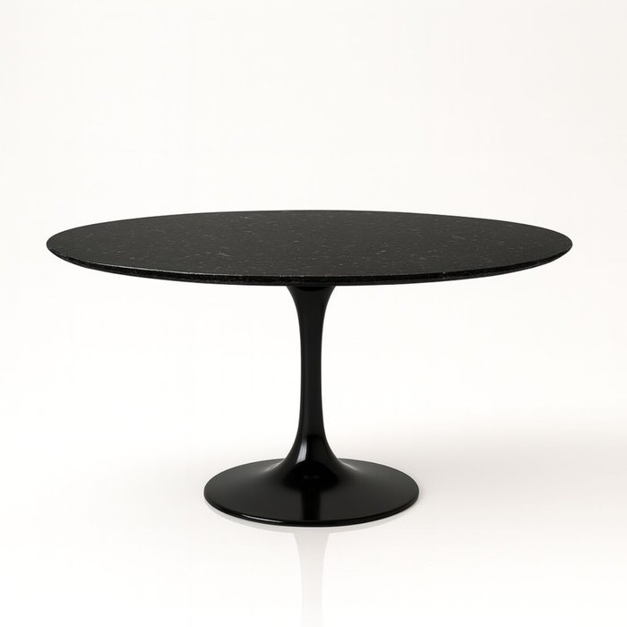 Mesa de Jantar Saarinen Redonda, Tampo 80 cm em Mármore São Gabriel, com contra tampo em MDF, Base em alumínio fundido com pintura automotiva PU.