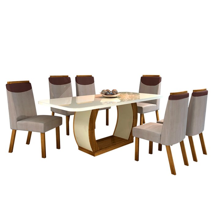 A qualidade também é vista no conjunto de cadeiras. Estofadas com espuma D23 e revestidas com uma camada de espuma hipersoft, elas oferecem o máximo de maciez. E, para um toque extra de conforto, o jogo de 6 cadeiras conta com revestimento especial tipo veludo.