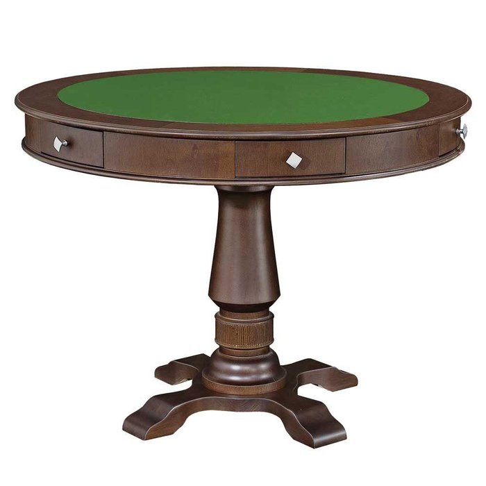Mesa de jogos carteado 4 lugares Victoria redonda com tampo reversível com gavetas e porta copos Imbuia da Gran Belo confeccionada em madeira maciça de jequitibá, compensado e MDF laminado. Possui pintura exclusiva com fundo e verniz, além de detalhes da própria madeira que proporcionam ao produto uma beleza única. Contém gavetas com puxadores metalizados e tampo reversível, possibilitando seu uso tanto para jogar cartas de baralho como para mesa de jantar, conseguindo agregar elegância e praticidade ao ambiente.