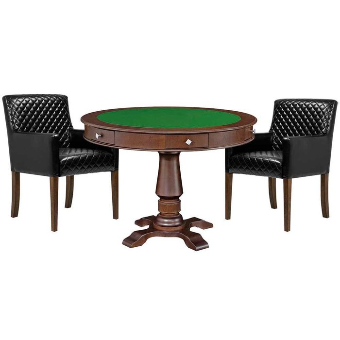 Mesa de Jogos Carteado Victoria Redonda Tampo Reversível Imbuia com Kit 2 Cadeiras Liverpool Corino Preto Matelassê - Gran Belo confeccionada em madeira maciça de jequitibá, compensado e MDF laminado. Possui pintura exclusiva com fundo e verniz, além de detalhes da própria madeira que proporcionam ao produto uma beleza única. Contém gavetas com puxadores metalizados e tampo reversível, possibilitando seu uso tanto para jogar cartas de baralho como para mesa de jantar, conseguindo agregar elegância e praticidade ao ambiente.Dimensões do Produto (Mesa de Jogos):