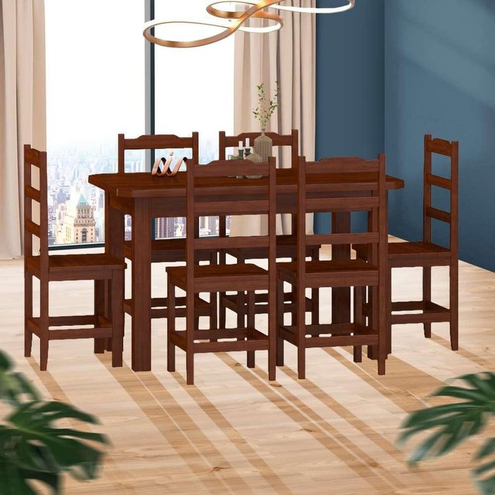 Apresentamos uma mesa e cadeiras ideais para seu espaço. A mesa possui estrutura e pés em madeira maciça de Pinus, com design robusto e tampo em MDP. As cadeiras são feitas 100% em madeira maciça de Pinus, entregues montadas e suportam até 150kg cada. Uma combinação perfeita de estilo, sustentabilidade e funcionalidade para o seu ambiente.Especificações da Mesa- Estrutura e pés em madeira maciça de Pinus (madeira reflorestada)- 4 pés resistentes- Design robusto e clássico- Tampo em MDP Especificações da Cadeira- 100% madeira maciça de Pinus (madeira reflorestada)- Cadeiras são entregues montadas para maior comodidade- Suporta até 150kgDimensões da Mesa: Largura 88cm; Profundidade 160cm; Altura 81cm.Dimensões da Cadeira: Largura 39,6cm; Profundidade 38,5cm; Altura 100cm.Altura do Assento Até o Chão: 46cm.Itens Inclusos: 1 mesa com 6 cadeiras.Complexidade da montagem: Média, pode ser montado por apenas uma pessoa e/ou necessite de maior conhecimento para montagemRecomendações de uso, manutenção e limpeza: Limpar com flanela ou pano macio seco, não utilizar produtos abrasivos, desengordurantes, álcool ou solvente. Não expor o produto diretamente à luz solar e à umidadeGarantia: 3 mesesOBS: Foto meramente ilustrativa, objetos, utensílios e decoração não fazem parte do produto.Tonalidade das cores poderão sofrer alterações conforme a configuração de cada monitor ou tela do smartphone.Manual de Montagem e Instalação da Mesa.