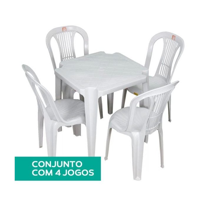 Mesa de Plástico Kit com 4 Mesas e 16 Cadeiras Esse kit de 4 mesas de plástico quadrada e 16 cadeiras é ideal para quem deseja comprar em quantidade e com o melhor custo benefício. O jogo de mesa branca de plástico é ideal para seu utilizada em buffets, chácaras, espaços de lazer, lanchonetes, bares, restaurantes, botecos, quiosques, além do uso residencial. Um de seus diferenciais é seu material de fabricação de altíssima qualidade, resistência e durabilidade, que garantem a excelência da mesa de bar com cadeiras. Por ser de plástico, o kit com 4 mesas de plástico e 16 cadeiras é leve e fácil de ser transportada. Além disso, é fácil de ser limpa e empilhada, o que permite otimizar espaço e deixar o ambiente organizado. Cada cadeira tem capacidade para suportar até 120kg. Ao comprar a mesa branca de plástico com cadeiras, você adquire um produto de alta qualidade para o seu negócio! Informações Técnicas: Material Polipropipleno e aditivo Empilhável Sim Cor Branco gelo Peso suportado 120kg Garantia 90 dias Medidas da Mesa (unitária) Altura 73cm Largura 71cm Profundidade 71cm Peso 3,95kg Medida da Cadeira (unitária) Altura 90cm Largura 45cm Profundidade 45cm Peso 2,1kg