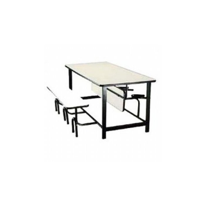 Mesa Refeitório com tampo retangular em fórmica com borda em PVC e mochos escamotáveis em fórmica.