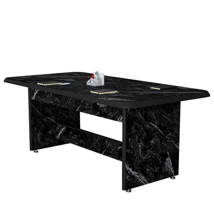 Seu design contemporâneo com acabamento marmorizado confere requinte ao espaço, enquanto a base reta oferece firmeza e estabilidade durante o uso. O tampo amplo permite acomodar notebooks, documentos e materiais de trabalho com conforto, favorecendo a produtividade e o trabalho em equipe.