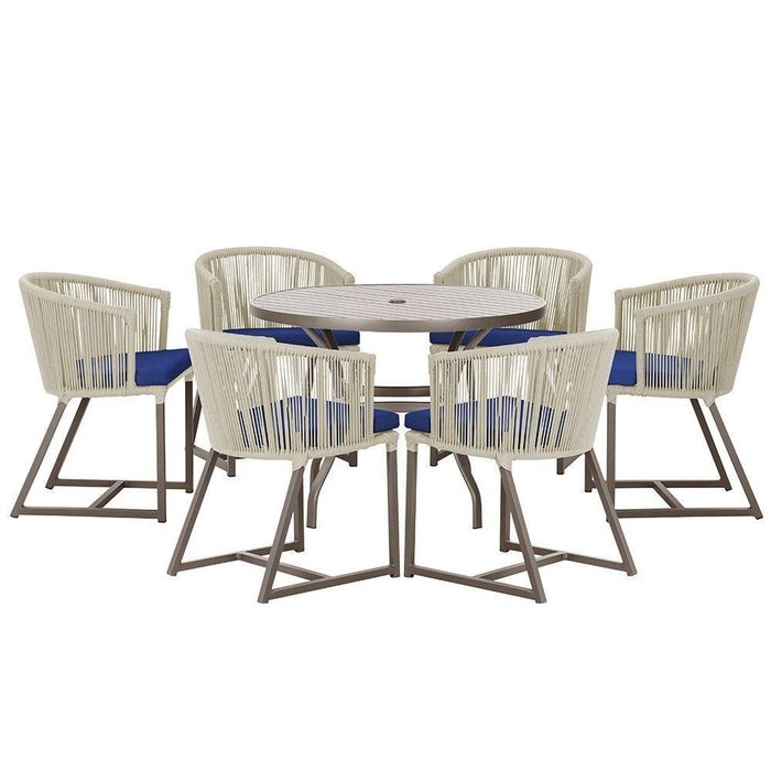 Combinando estilo e resistencia, esta Mesa e cadeiras traz o melhor do design contemporaneo em aluminio com micro pintura e acabamento em corda nautica. O Estofado impermeavel completa o conforto e a funcionalidade, tornando-a ideal para ambientes externos e internos.