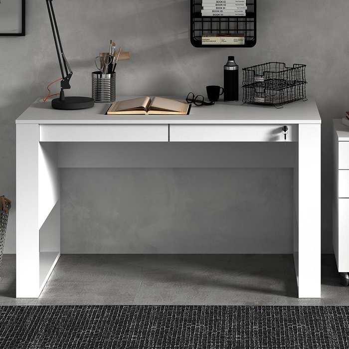 Mesa e Escrivaninha Para Escritório Com 2 Gavetas e Chave: Branco