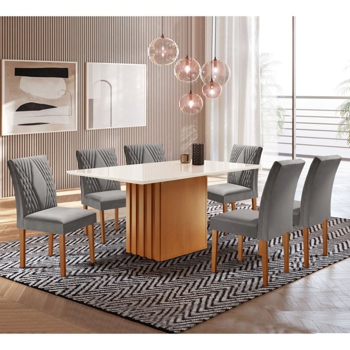 Mesa Elis 1,70x0,90 com 6 Cadeiras Elis Tampo Slim Plus Vidro Off White Cel Móveis Cinamomo/off Whit