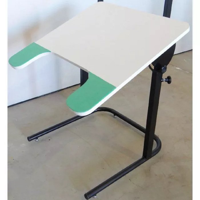 Confeccionada em tubo de aço tubular, com solda MIG e pintura Epóxi. Possui regulagem de altura e de inclinação de 0º á 180º, com ponteira de borracha niveladora e antiderrapante. Tampo em MDF 18mm revestido em ambas as faces em laminado Melamínico. Tamanho 70cm x 70cm com recorte em U, com acabamento lateral em PVC e apoio de cotovelos em EVA.