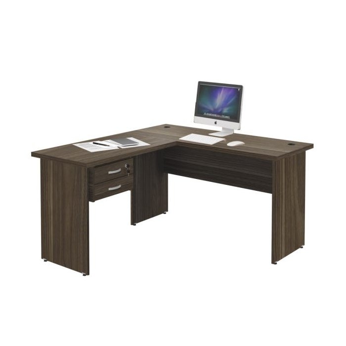Formato em L composto por Mesa de 136 x 53 cm e Mesa Lateral de 90 x 53 cm. Opção de montagem pode ser dos dois lados (esquerdo ou direito).