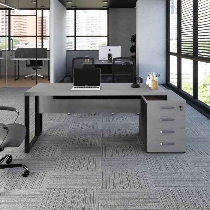 Mesa Escritório Diretor 1,70m a 1,92m 4 Gavetas Pé Metal F5 Cinza Sagrado/Preto