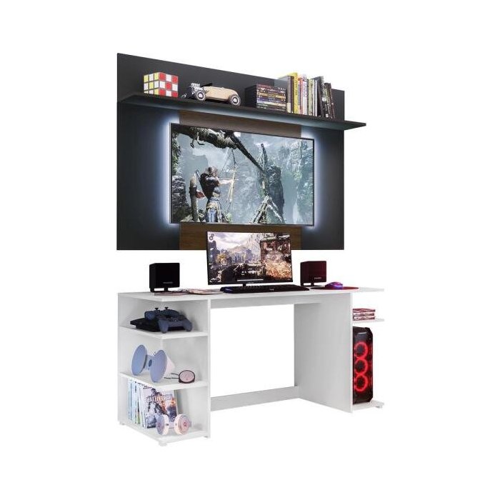 Mesa Gamer com Painel e Suporte TV 55 Polegadas Guilda Plus Multimóveis Branco/Preto/Madeirado