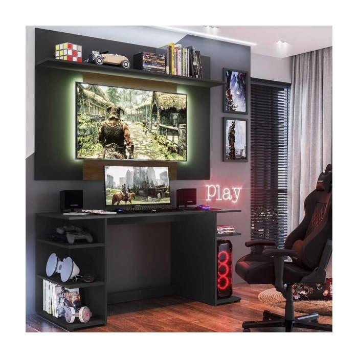 Mesa Gamer com Painel TV 55 Polegadas e Prateleira Guilda Plus Multimóveis Preto/Madeirado