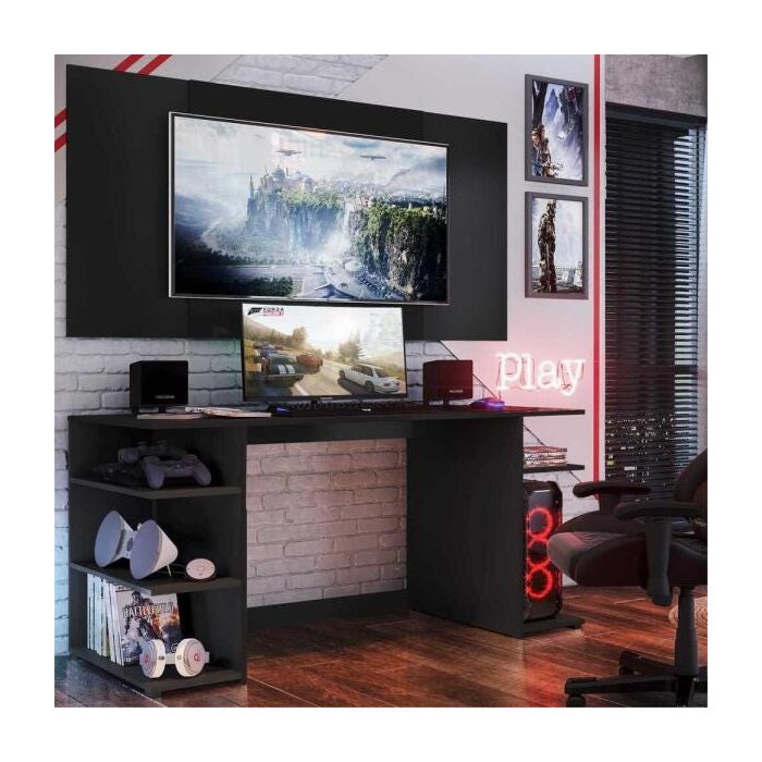 Mesa Gamer Escrivaninha com Painel Tv 65 Polegadas Guilda Multimóveis Preta Preto