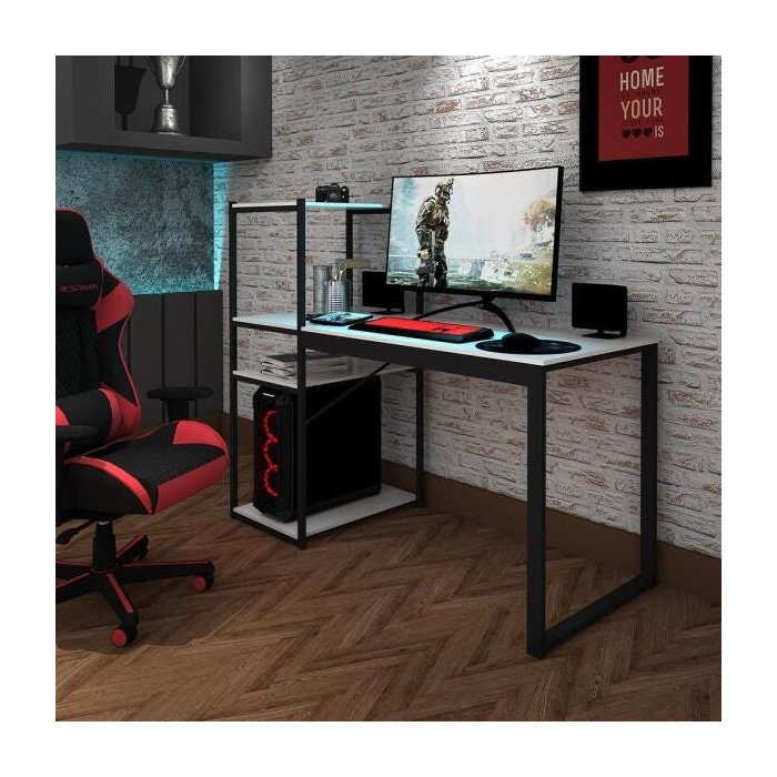 A Mesa Gamer tem um design moderno despojado e encantador, traz as pessoas que querem um ambiente diferenciado um toque especial de design. Suas prateleiraas com espaço extra para armazenar livros e enfeites a Mesa traz um ar de organização e inovação ao seu escritório, a cores modernas trazem um ar de sofisticação ao ambiente.