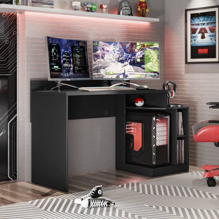 A escrivaninha gamer é muito popular entre aqueles que gostam de jogar jogos de computador. Geralmente tem um design moderno e elegante, além de recursos extras, como suportes para monitor e gavetas para guardar seus acessórios de jogos.