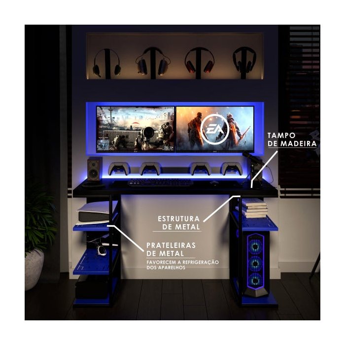 Mesa Gamer Metal e Madeira com Prateleiras Azul e Preta