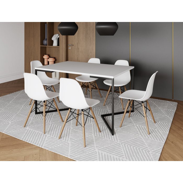Mesa Industrial Base Ferro Preto em V Tampo 137x90 Branco 4 Cadeiras Eames Madeira Assento BrancoA mesa de jantar é um dos poucos móveis que efetivamente reúne a família para saborear um bom prato ao lado das pessoas que mais ama. E para garantir que o seu ambiente fique impecável, conte com a Mesa De Jantar Industrial e as Cadeiras Eames. Os modelos buscam inspiração no estilo industrial, mas, ao mesmo tempo, abre um leque de possibilidades na hora de colocar a criatividade em prática e fazer as melhores harmonizações para a sua sala de jantar ou cozinha. Distribuindo sofisticação ao cômodo, você ainda pode combiná-la com as outras peças da Linha Industrial para conquistar um visual completo.