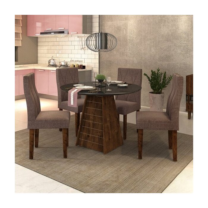 Mesa Jantar Dj Móveis Fler Redonda 1035x1035 com 4 Cadeiras Ágata Rustico Malbec Preto e Linho Bronze