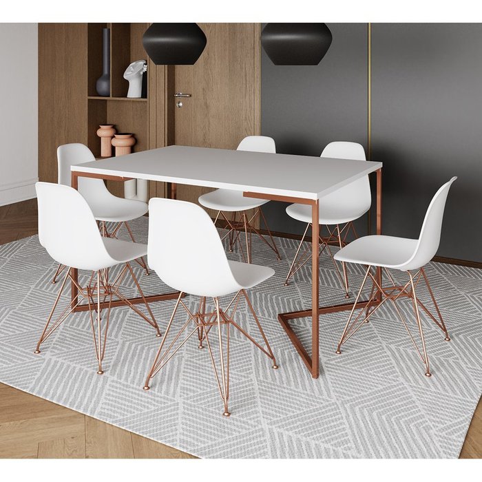 Mesa Jantar Industrial Retangular 137x90cm Branca Base V c/ 6 Cadeira Eames Eiffel Brancas Base Cobr