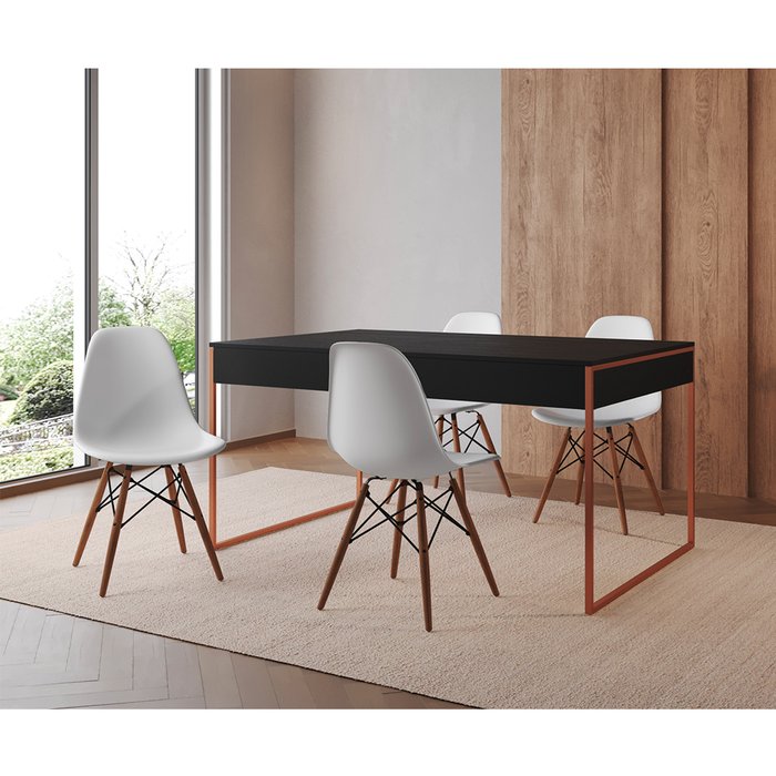 Mesa Jantar Industrial Retangular Filadélfia Preta 137x90cm Base Cobre com 4 Cadeiras Brancas Eiffel