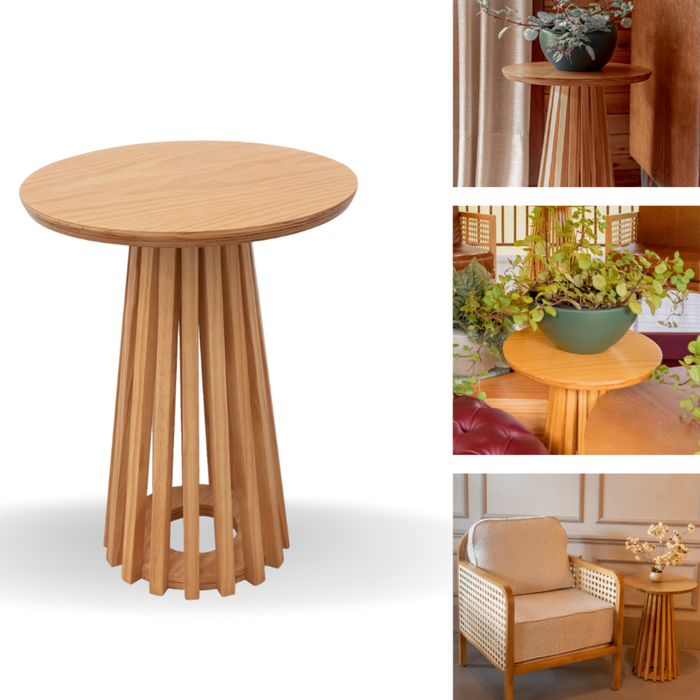 Mesa Lateral Apoio Redonda Cone Madeira Ripada Design Luxo Mel Pinus