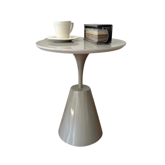 Mesa Lateral Cone Masp Redonda, Tampo em MDF Laca Cinza, Base com estrutura em alumínio fundido e fiberglass resinada e acabamento em pintura automotiva PU.