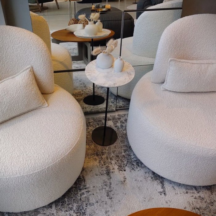 Possuem tampos com 30 cm de diâmetro, espessura de 18mm em MDF -BP, usinados em centro CNC produzindo cortes perfeitos e borda bicôncova, revestidos através de imersão líquida especial gerando um padrão Marmorizado Único e Exclusivo em cada tampo nas suas superfícies superior, inferior e bordas, proporcionando um acabamento elegante e impecável.