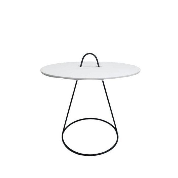 ]Mesa lateral de apoio, com alça de transporte, fabricada em aço de construção e acabamento industrial e pintura com verniz transparente fosco epóxi e tampo em madeira laqueada na cor branca. As dimensões do produto são 60 x 70 cm de altura Peça única, exclusividade e design.