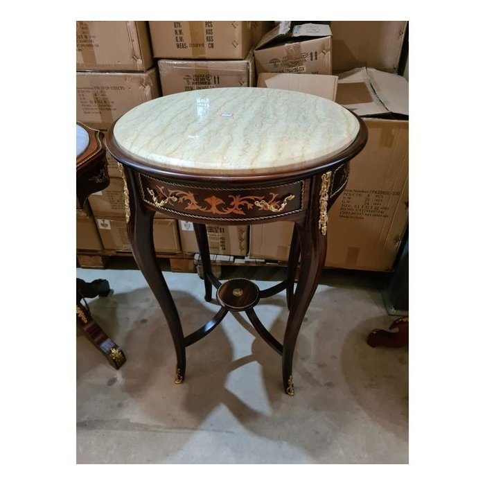 Mesa Lateral Redonda c Gaveta Marchetaria Marmore Veios Apliques Bronze