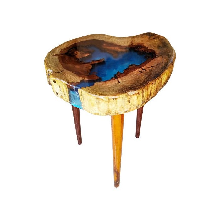 Mesa Lateral Rústica Tronco de Árvore Resina Azul