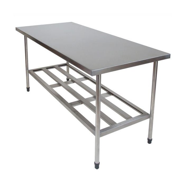 Mesa total Inox Sulfisa. Mesa de apoio. Medidas: CxAxP 1.20x85x70. Construída inteiramente em aço inoxidável AISI 430, pés tubulares com sapatas niveladoras em polietileno, tampo liso e prateleira gradeada.