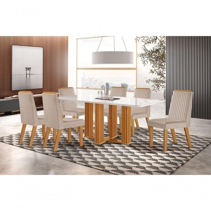 Mesa Lj Moveis Florenca 1,80x0,90 Vd 4mm Chf Off W 6 Cd-lj - Suedy Creme - Tec164 Castanho Cinamomo Laka Cor: Off White Mesa LJ Florença Para 6 Cadeiras Com Vidro Off White - Castanho Cinamomo A Mesa LJ é uma opção elegante e funcional para compor a sua sala de jantar. Com um design moderno, ela é projetada para acomodar 6 cadeiras, proporcionando conforto e estilo para suas refeições e encontros familiares. Características:Modelo: FLORENÇACapacidade: Para 6 cadeirasCor do Tampo: Off WhiteCor da Base: Castanho CinamomoMaterial do Tampo: Vidro 4mm espessuraMaterial da Base: MDFAcabamento: Pintura UVDimensões Aproximadas:Altura: 80 cmLargura: 90 cmProfundidade: 180 cmO tampo em vidro confere sofisticação ao conjunto, enquanto a estrutura em MDF com acabamento em pintura UV oferece durabilidade e resistência. A combinação das cores Off White e Castanho Cinamomo agrega um toque de contemporaneidade ao ambiente. Com a Mesa LJ , você terá um espaço agradável e convidativo para compartilhar refeições com amigos e familiares. Seu design versátil permite harmonização com diversos estilos de cadeiras, possibilitando a criação de uma sala de jantar personalizada e única. Transforme sua sala de jantar com a Mesa LJ . Adquira já e desfrute de momentos especiais com muito conforto e beleza! MESA DARA ALTURA : 80,00 LARGURA: 90,00 COMPRIMENTO : 1,80 VIDRO SERIGRAFADO TEMPERADO 4MM TAMPO TAMBURATO CHANFRADO CADEIRA DARA : ALTURA : 99,00 LARGURA: 43,00 PROFUNDIDADE: 54,50