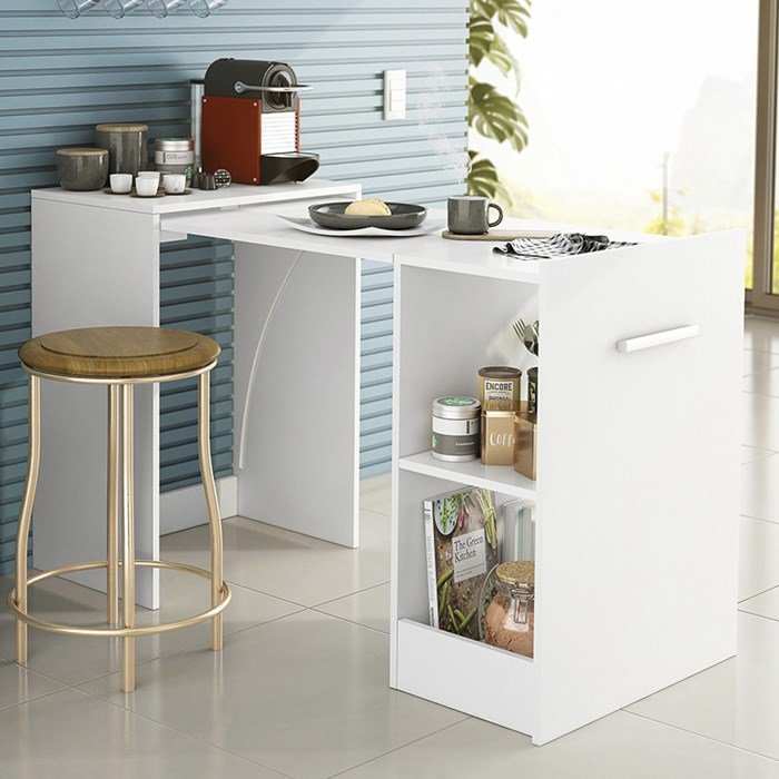 Mesa compacta com sistema dobrável, é versátil e de multifunção, possui estrutura em MDP e acabamento em pintura UV. Conta com 02 nichos, quando aberta torna-se uma mesa e fechada como balcão guardando todos os itens em seu interior, super compacta, adapta-se com facilidade em pequenos espaços e é muito versátil, podendo ser utilizada de diversas maneiras e em qualquer ambiente, cheio de estilo este móvel é perfeito para quem precisa otimizar o espaço. Este móvel chegará em sua casa separado em 01 volume.